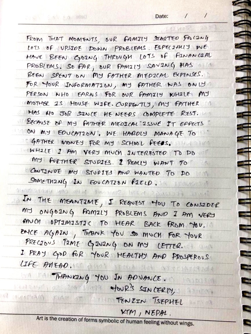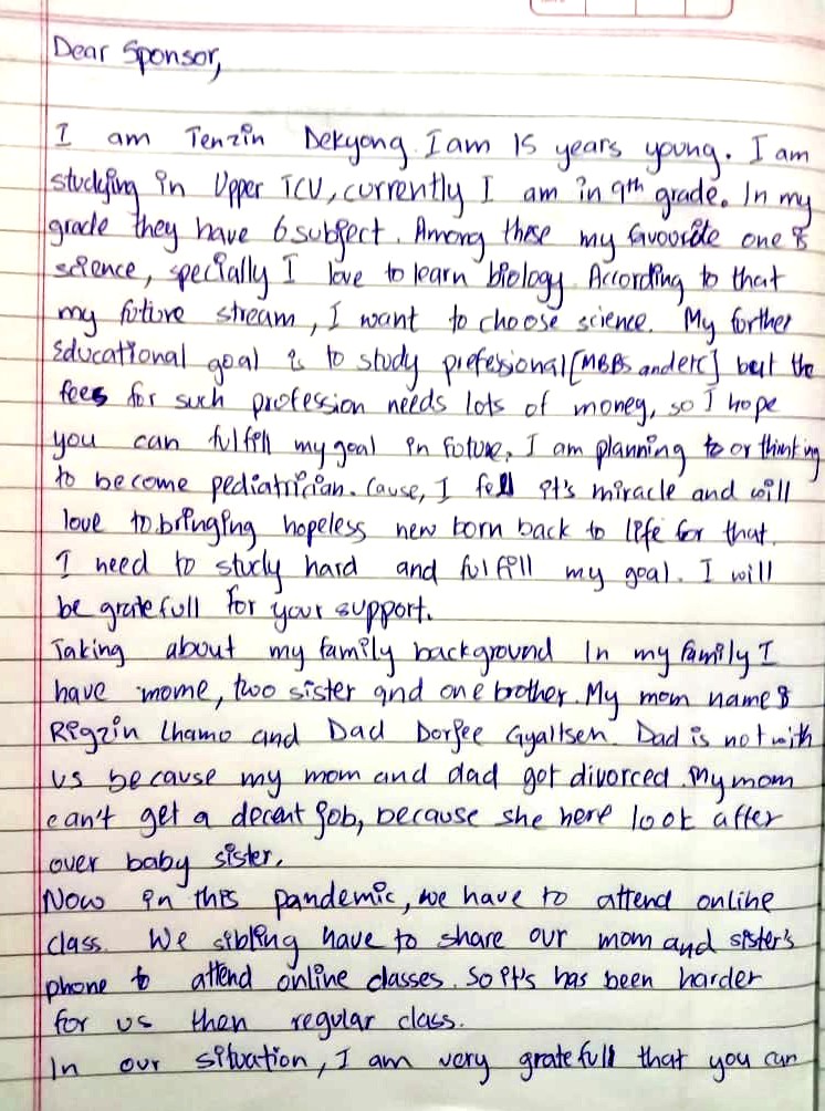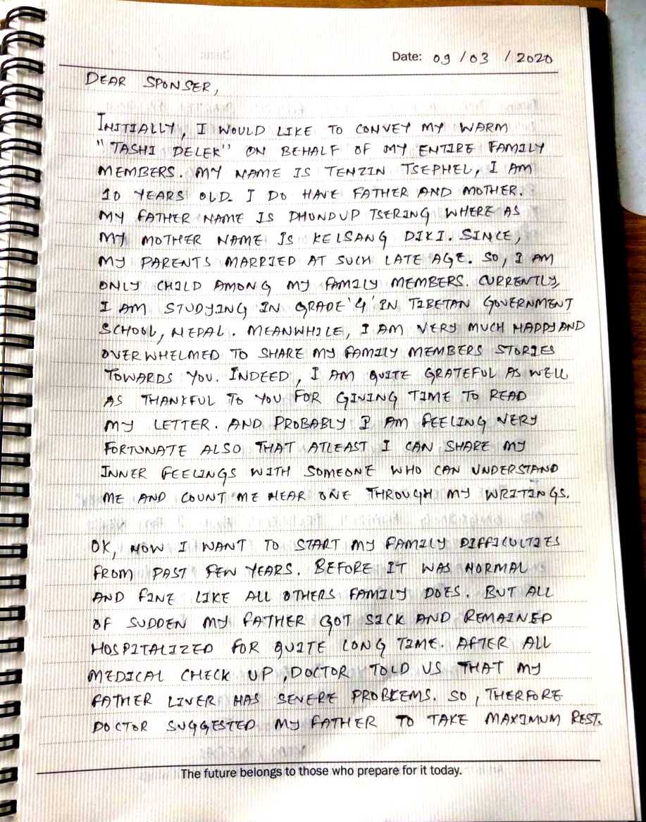 We want to share with you some of the life stories of the Tibetan refugee children and give you an opportunity to read the original “thank you” letters from the children sent to the generous donors who have supported them and helped their families